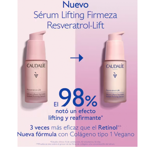 El Sérum Lifting Firmeza Resveratrol-Lift corrige las arrugas y alisa el óvalo facial. Su fórmula ultraconcentrada actúa instantáneamente tensando los rasgos y reafirmando visiblemente la piel. A la vanguardia de la innovación, el Colágeno tipo 1 Vegano*, colágeno de origen vegetal, asociado a una patente antiedad exclusiva (Resveratrol de vid, ácidos hialurónicos y booster de colágeno vegano) para estimular los 3 tipos de colágeno.