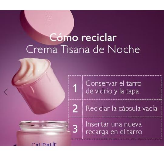 El tarro de la Crema Cachemir o de la Crema Tisana de Noche Resveratrol?Lift se recarga fácilmente gracias a las cápsulas recargables. Este sistema de ecocápsulas, más respetuoso con el medio ambiente, supone una disminución de embalaje del 85%* al comprar una recarga.