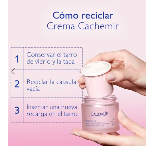 El tarro de la Crema Cachemir o de la Crema Tisana de Noche Resveratrol?Lift se recarga fácilmente gracias a las cápsulas recargables. Este sistema de ecocápsulas, más respetuoso con el medio ambiente, supone una disminución de embalaje del 85%* al comprar una recarga.