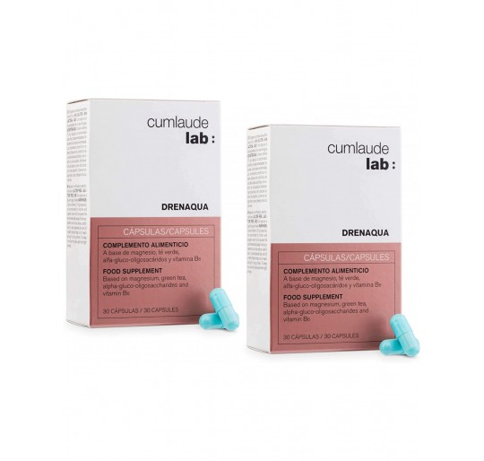 CUMLAUDE LAB Drenaqua Pack 2 x 30 Cápsulas, es una fórmula completa que ayuda a eliminar líquidos de forma natural, favoreciendo el tránsito intenstinal y contribuyendo a una mejor silueta. Contiene té verde, probióticos y prebióticos.