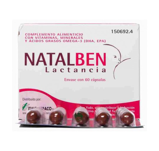 Natalben Lactancia 60 Caps. Complemento alimenticio con vitaminas, minerales y ácidos grasos omega 3. Contiene la mayoría de nuetrientes esenciales para el periodo de lactancia.