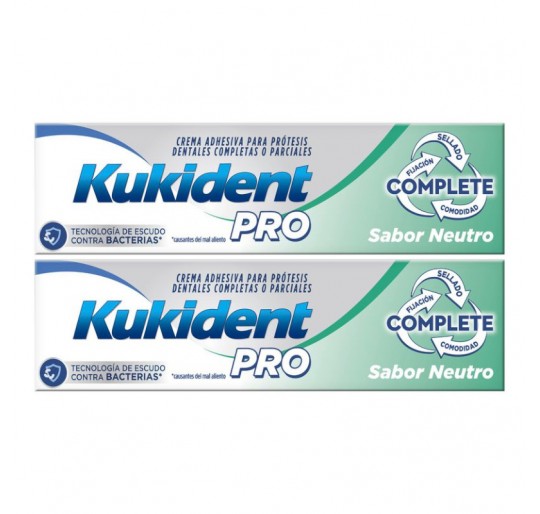 Kukident Triplo Sabor Neutro 2x47g.Es un adhesivo para prótesis dentales diseñado especialmente para un cuidado completo. No posee sabor y ejerce una solución completa 3 en 1