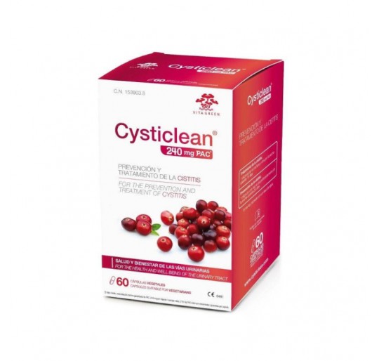 Cysticlean 240 mg 60 Cápsulas. Complemento alimenticio elaborado con extracto concentrado de árandano rojo americano. El arándano rojo americano es una fuente vegetal de ácido químico, ácido cítrico y ácido málico. Previene la cistitis.