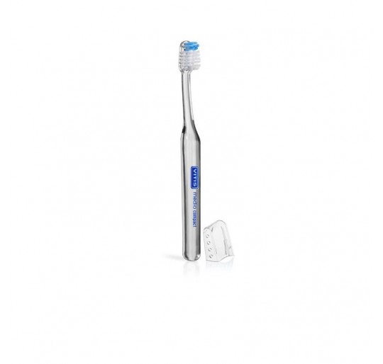 Cepillo de dientes medio de tamaño reducido perfecto para llevarlo en el bolso. Con regalo de pasta de dientes de 15 ml.