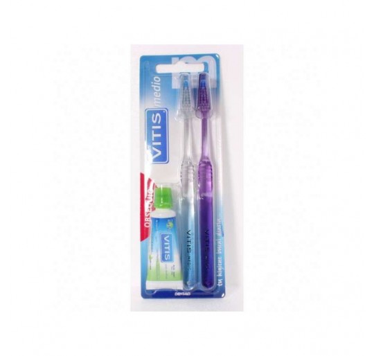 -Vitis medio es un cepillo de uso diario con un cabezal de forma diamantada que permite llegar a las zonas de difícil acceso de la cavidad bucal. Sus filamentos de dureza media y con perfil ondulado, acceden a los espacios interdentales, a la vez que facilitan la limpieza en el contorno de las encías.