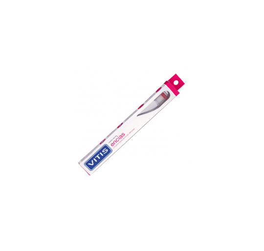 VITIS® encías es un cepillo de uso diario con cabezal pequeño y filamentos suaves de perfil recto que permiten masajear las encías delicadas y estimularlas para facilitar la recuperación. Su uso no desgasta las restauraciones (empastes, fundas, etc.) y además previene la hipersensibilidad provocada por la exposición de los cuellos dentinales (recesión de las encías).