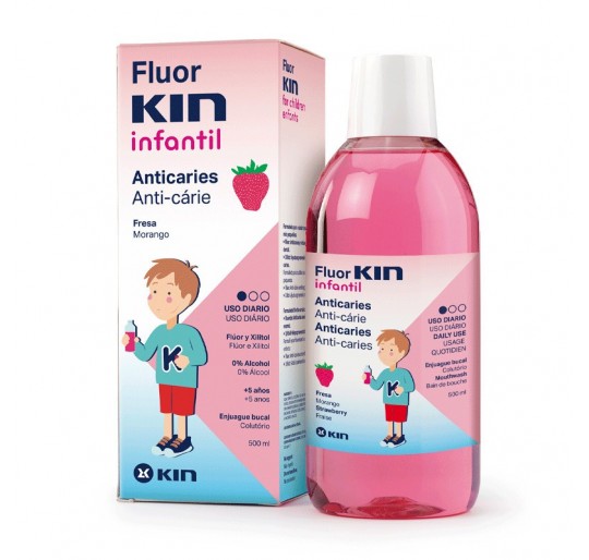 Es un enjuague bucal que complementa la acción diaria anti-caries de Fluor Kin Infantil Pasta dentífrica.