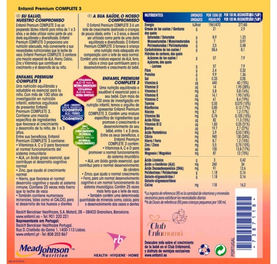 Enfamil Premium COMPLETE 3 es una leche de crecimiento formulada con todas las VITAMINAS requeridas, tales como 9 veces más VITAMINA C que la leche de vaca para favorecer el sistema inmune sano y VITAMINA D para el fortalecimiento y crecimiento de los huesos.