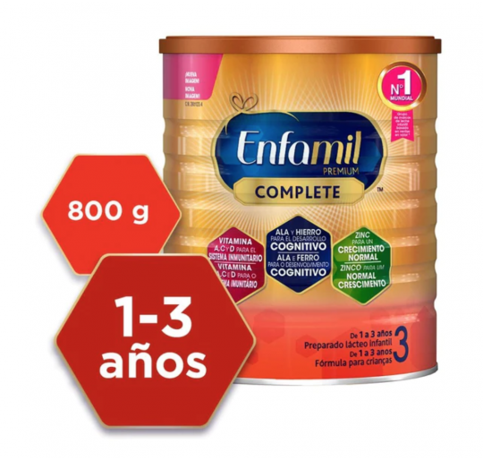 Enfamil Premium COMPLETE 3 cubre las necesidades nutricionales de su niño a partir de 12 meses como parte de una dieta diversificada.