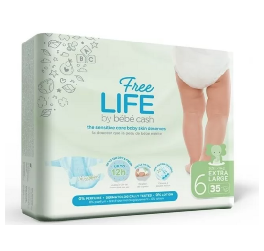 Bebé Cash Freelife Pañal 6 Extragrande +18Kg 35 Unidades son pañales desechables que están indicados especialmente para la protección de niños a partir de 18 kg. Tienen zonas elásticas y una forma anatómica que proporciona una comodidad máxima. Son suaves y transpirables. El sistema de cierre de tejido no tejido- velcro permite comprobar si el pañal necesita ser cambiado o simplemente adaptado.