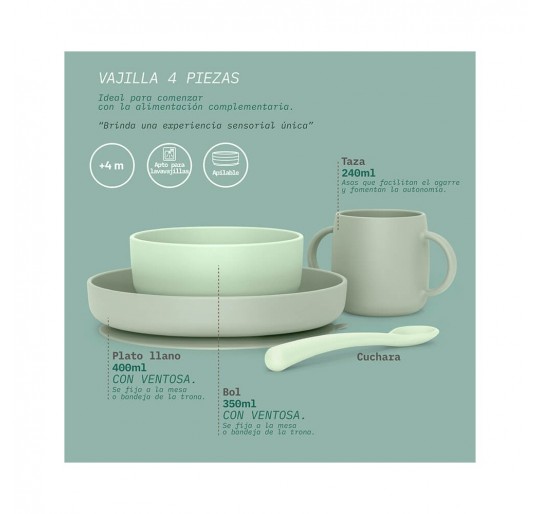 Vajilla de silicona, suave y flexible, de 4 piezas para bebés +6 meses. Apta para el lavavajillas. Ideal para comenzar con la alimentación complementaria para brindar una experiencia sensorial única.