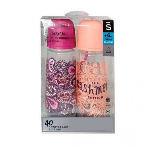 Elegantes biberones de la línea Suavinex 40 Anniversay edition, para bebés a partir de 6 meses.