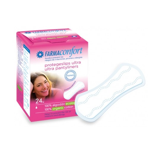 Farmaconfort Protegeslips Ultra 24 Unidades. Es un protegeslip adaptable elaborado con puro algodón ecológico que ayuda a prevenir los riesgo de picores, irritaciones y alergias.