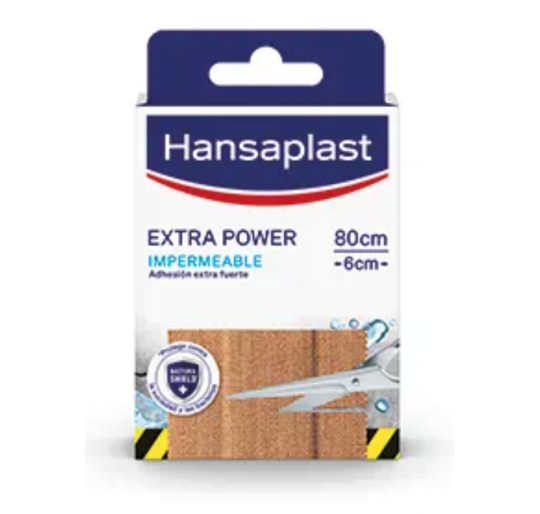 Hansaplast Apósito Extra Power es el primer apósito de tela fuerte que proporciona protección impermeable de la herida y flexibilidad en un solo producto.